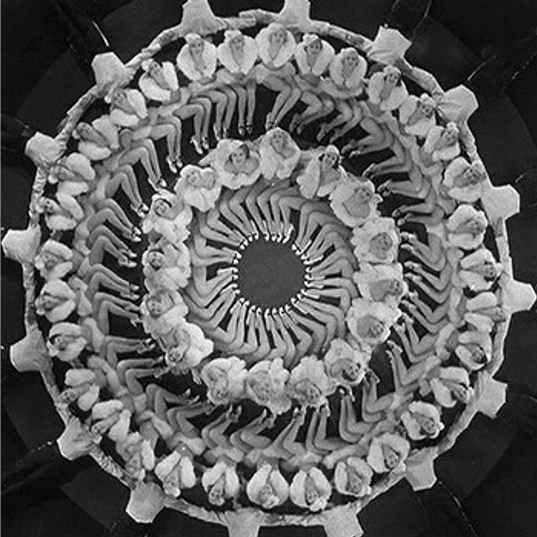 Graphic blocking occurs when characters are arranged in geometric shapes or patterns. Here are two stills that illustrate graphic blocking; the first is from a Busby Berkeley musical (a director famous for using wild examples of graphic blocking) and the second is from Fritz Lang’s Metropolis (see also the still in Sharman’s chapter) in which Lang combines graphic and social blocking to show the depressed state of the workers in this futuristic city.